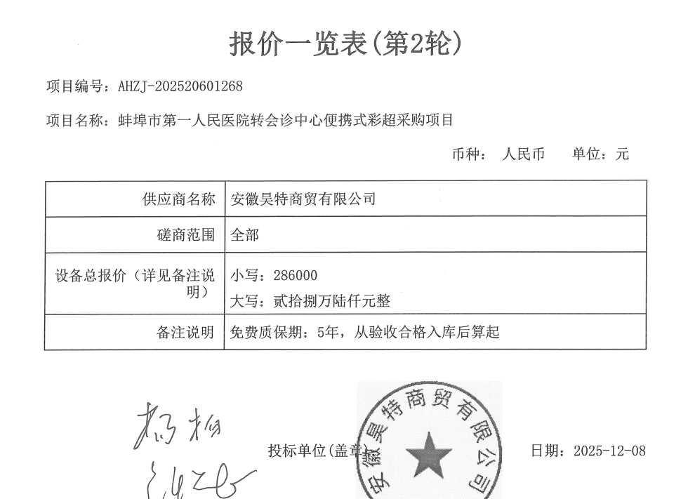2、项目名称:蚌埠市第一人民医院转会诊中心便携式彩超采购项目;